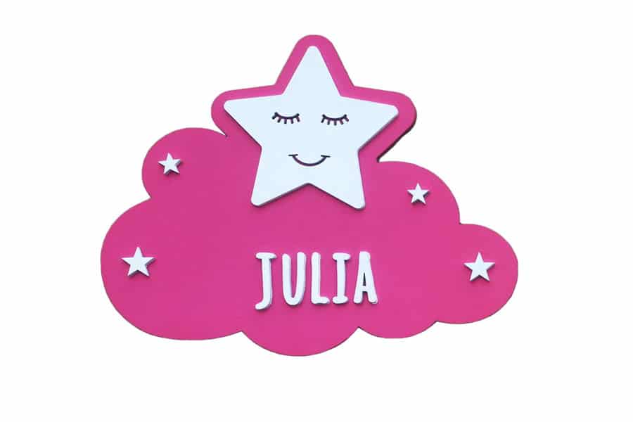 “Nube – Estrella” personalizada color Fucsia con detalles y nombre en color blanco, tamaño 26 x 21 cm.