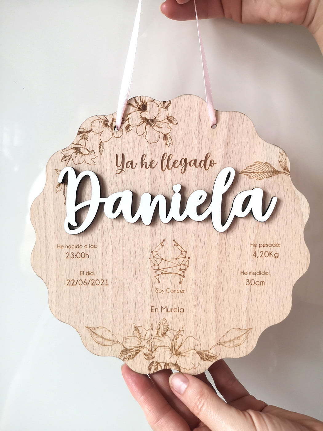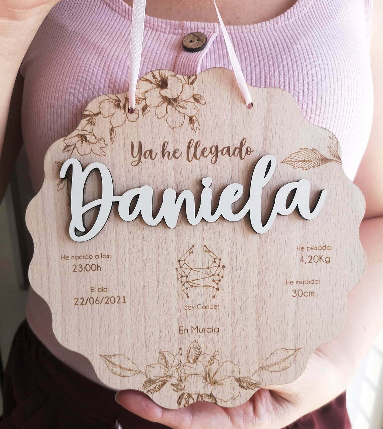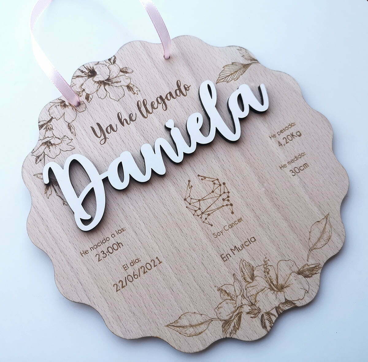 Que mejor regalo para un recién nacido que una placa personalizada en madera de haya, donde poder grabar ese momento tan especial en el que ese ser tan querido llegó al mundo, recordando la fecha, su peso, su medida, su horóscopo y lugar de nacimiento.